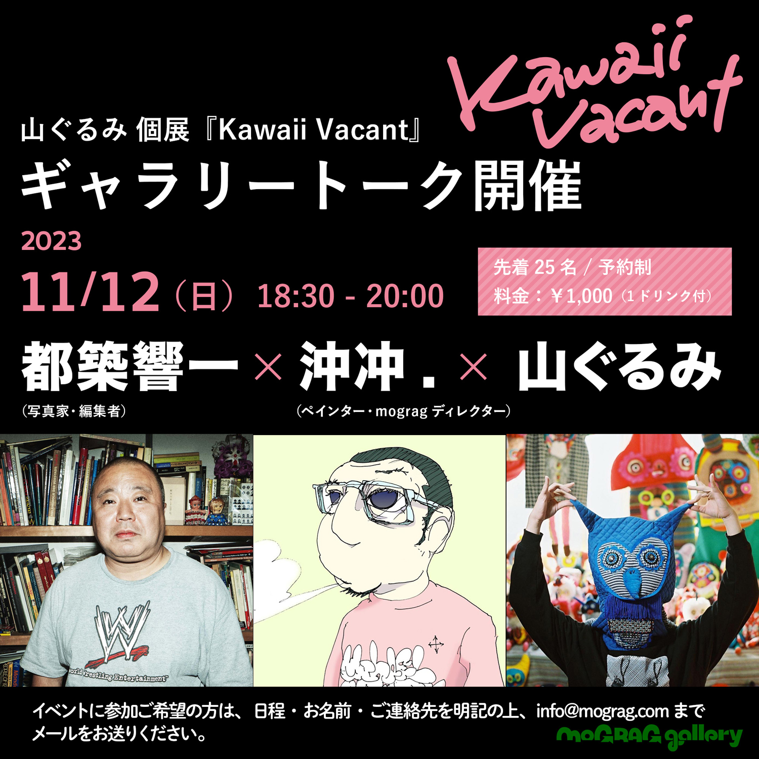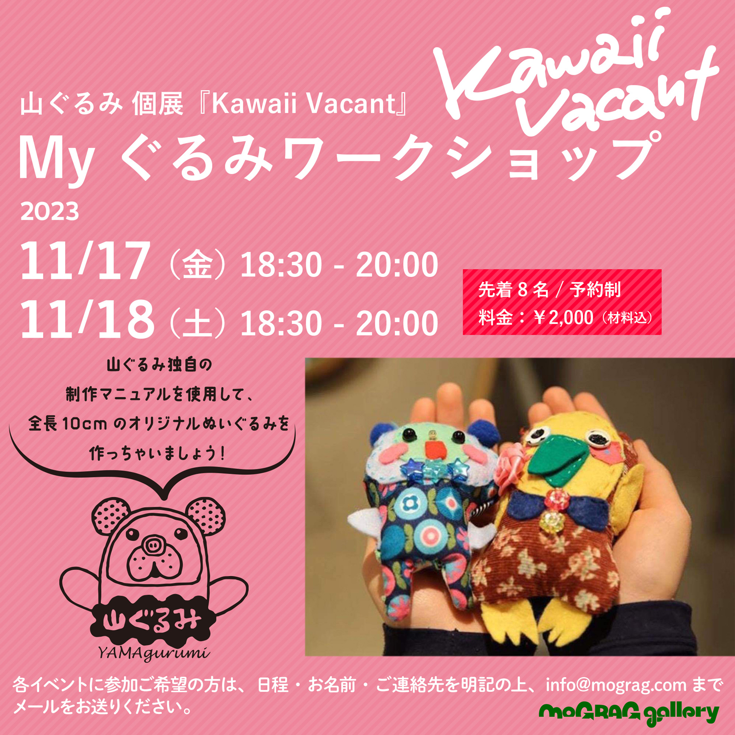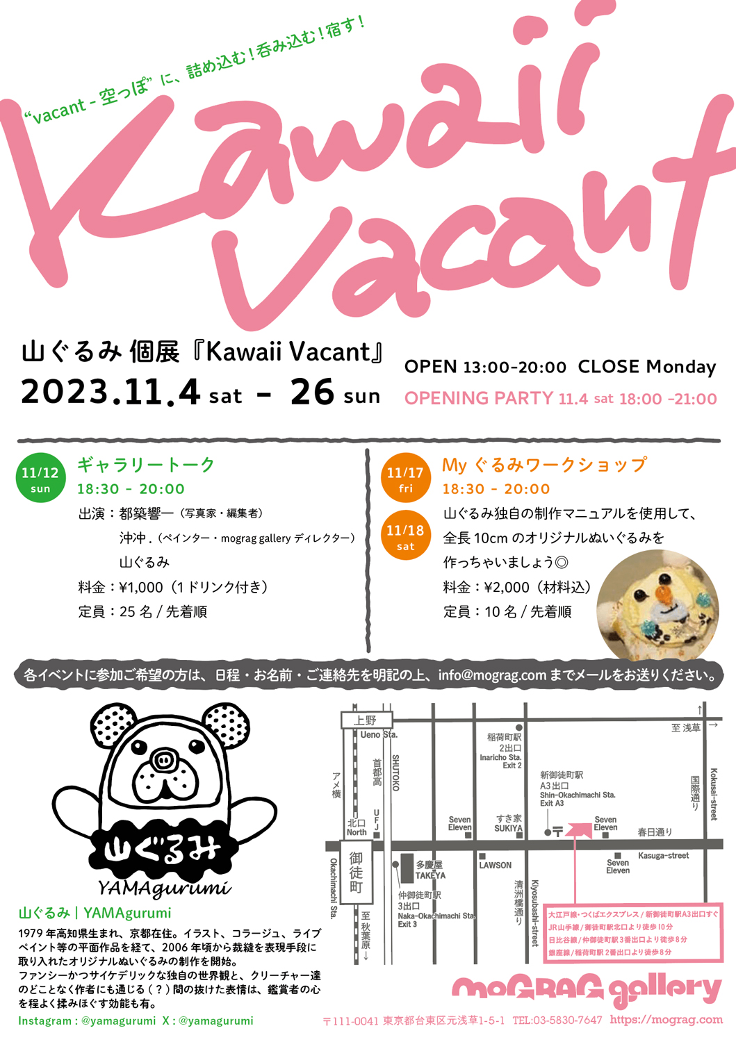 8月に個展「GROOMIN' SUMMER 2023」を東京・神保町 ネオ書房にて開催した山さきあさ彦による「山ぐるみ」が、ソロ・エキシビション「Kawaii Vacant」を東京・新御徒町 mograg galleryにて11月4日(土)から26日(日)まで開催。