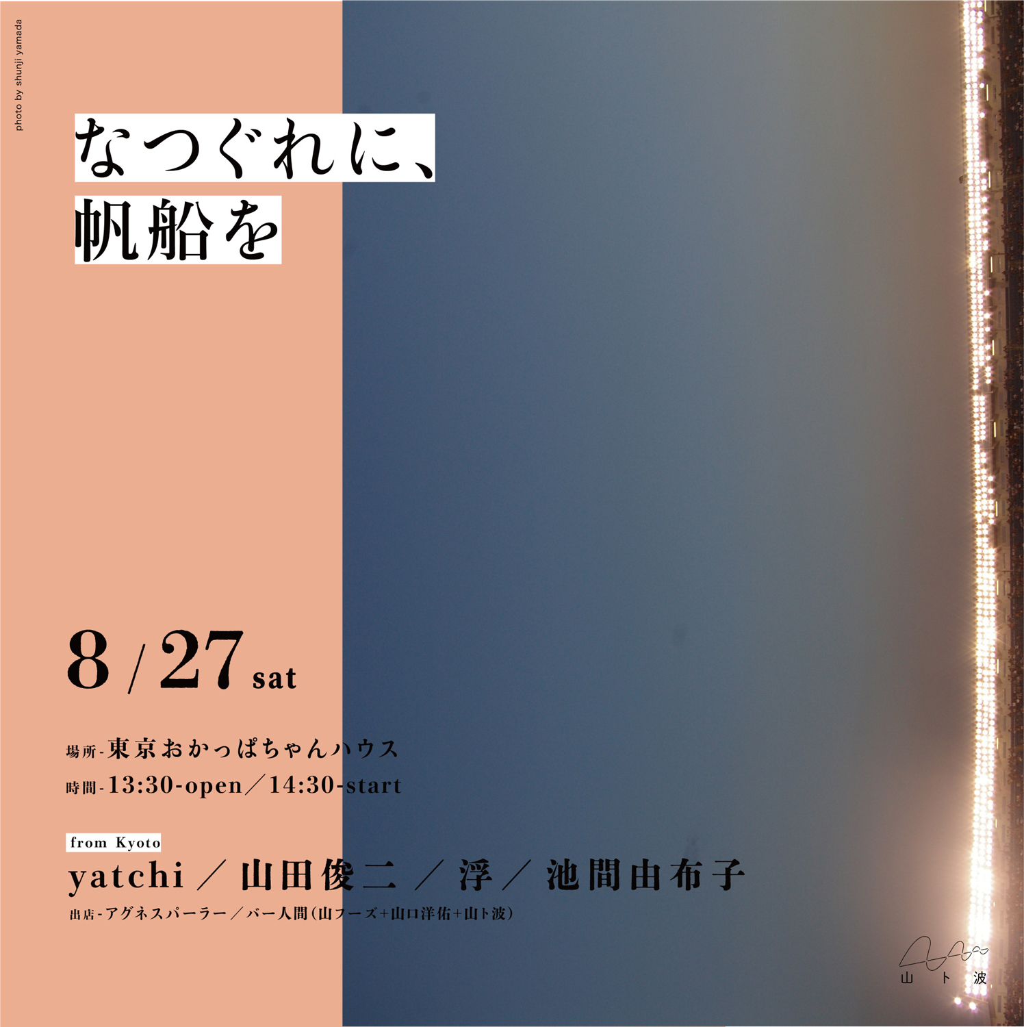 イベント / 展示企画を手がける鷹取 愛主宰「山ト波」とピアニスト・山田俊二が、ライヴ・イベント「なつぐれに、帆船を」を8月27日(土)に東京・上石神井 東京おかっぱちゃんハウスにて開催。山田に加え、浮と港(w/ 藤巻鉄郎 + 服部将典)やゆうれい(w/ 白と枝 + 松井亜衣)での活動も知られる米山ミサ aka 浮(ブイ)、2020年発表の3rdアルバム『My Landscapes』(2020)が話題作となった池間由布子、ムーズムズや折坂悠太(重奏)の鍵盤奏者としても活躍する京都在住のyatchiの4組が出演するほか、アグネスパーラー、バー人間(山フーズ + 山口洋佑 + 山ト波)によるフード出店も予定されています。予約状況は残少。