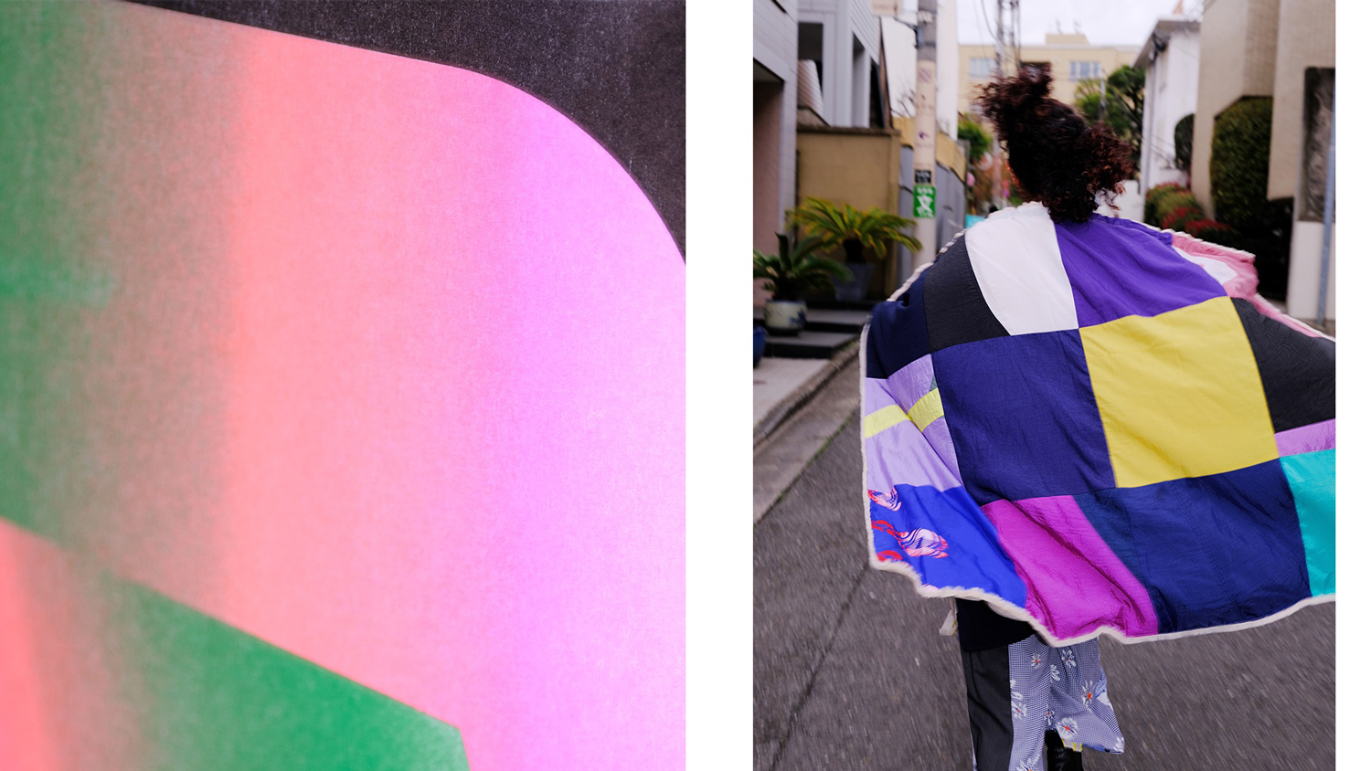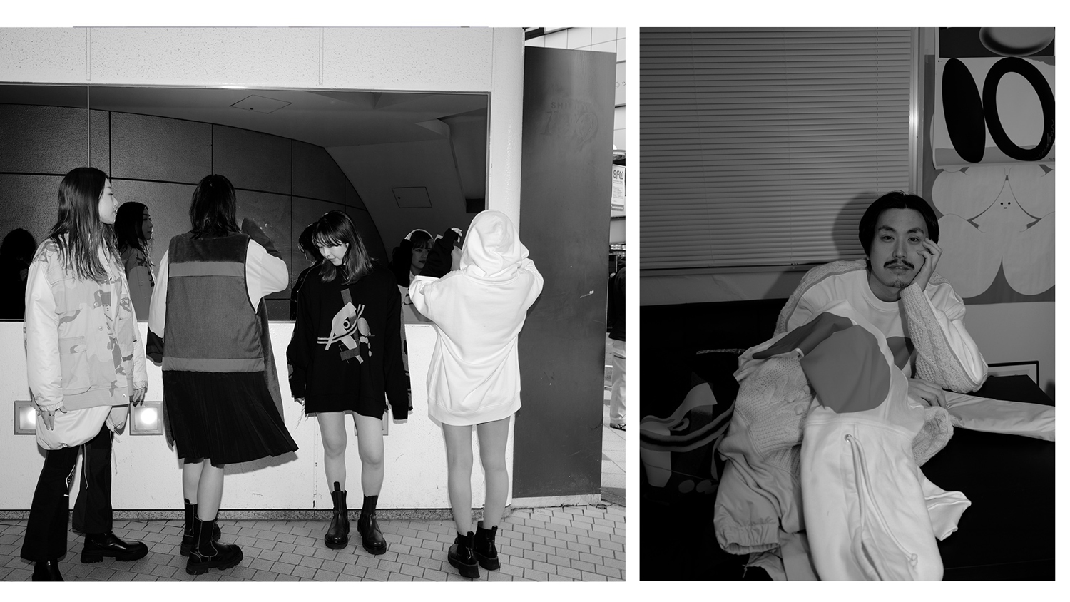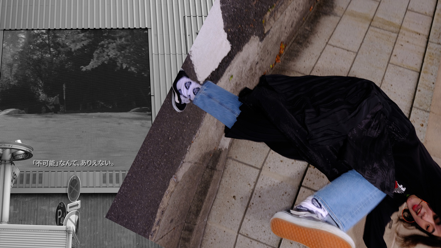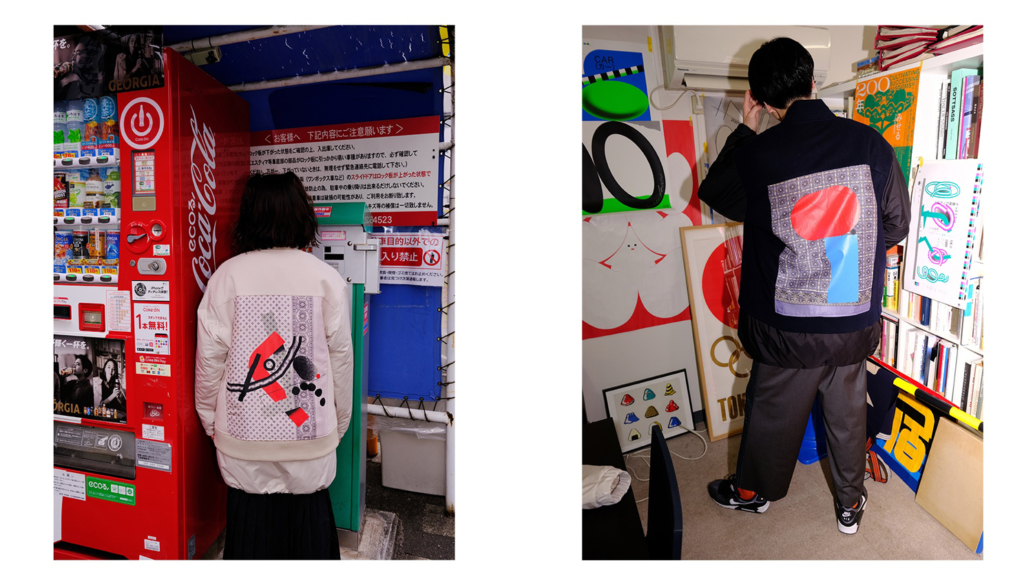 「YEAH RIGHT!!」の要である“remake”を表す“RE:”と、“混じる、混ぜる”を意味する“mix”をミックスした“RE:MIX”がテーマの同ルックでは、最果タヒ『パパララレレルル』(河出書房新社, 2021)の装丁や「第72回 NHK紅白歌合戦」のロゴなどを手がけるグラフィックデザイナー・佐々木 俊による3種のグラフィックをフィーチャーし、グラフィティのように生地やプリントをリメイクで“ボムする”同ブランド独自の手法“fab-graff”(= fabric graffiti)を用いたアイテムを中心に展開。前シーズンに引き続き、縫製工場、アトリエといった独自生産ラインにてデザイナーがセレクトしたヴィンテージ・アイテムを用いて制作されたコレクションとなっています。