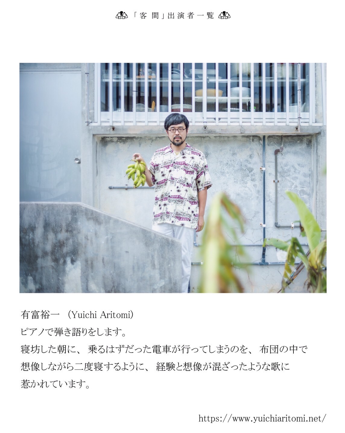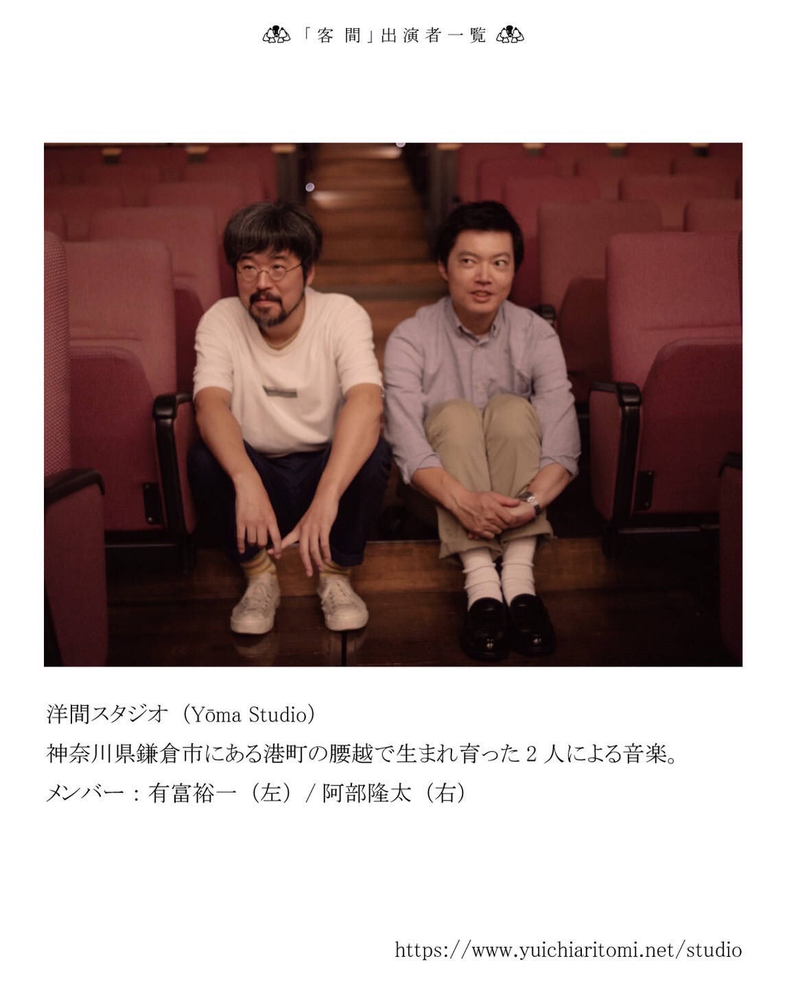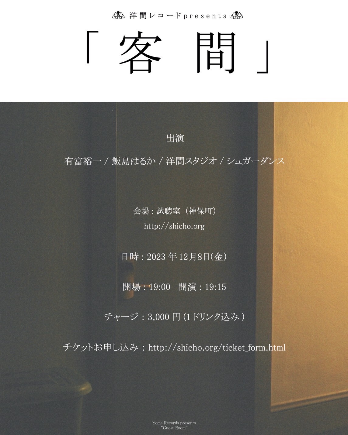 シンガー / コンポーザー・有富裕一と神奈川・鎌倉にアトリエ兼ショップ「HEADQUARTERS」を構える阿部隆太が主宰するレーベル「洋間レコード」が、ライヴ・イベント「客間」を12月8日(金)に東京・神保町 試聴室にて開催。