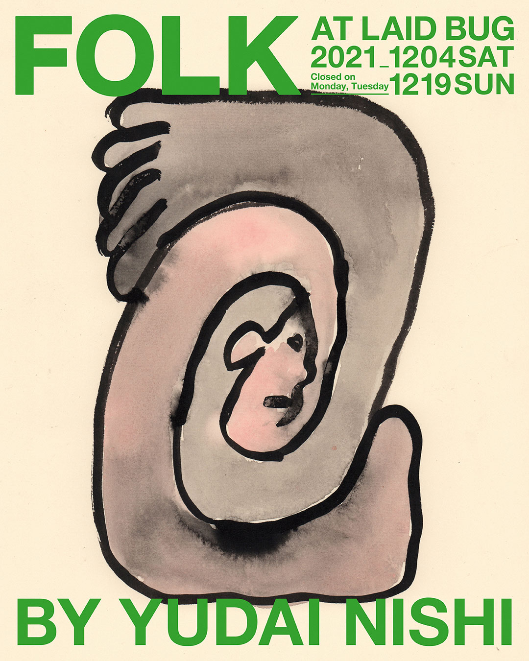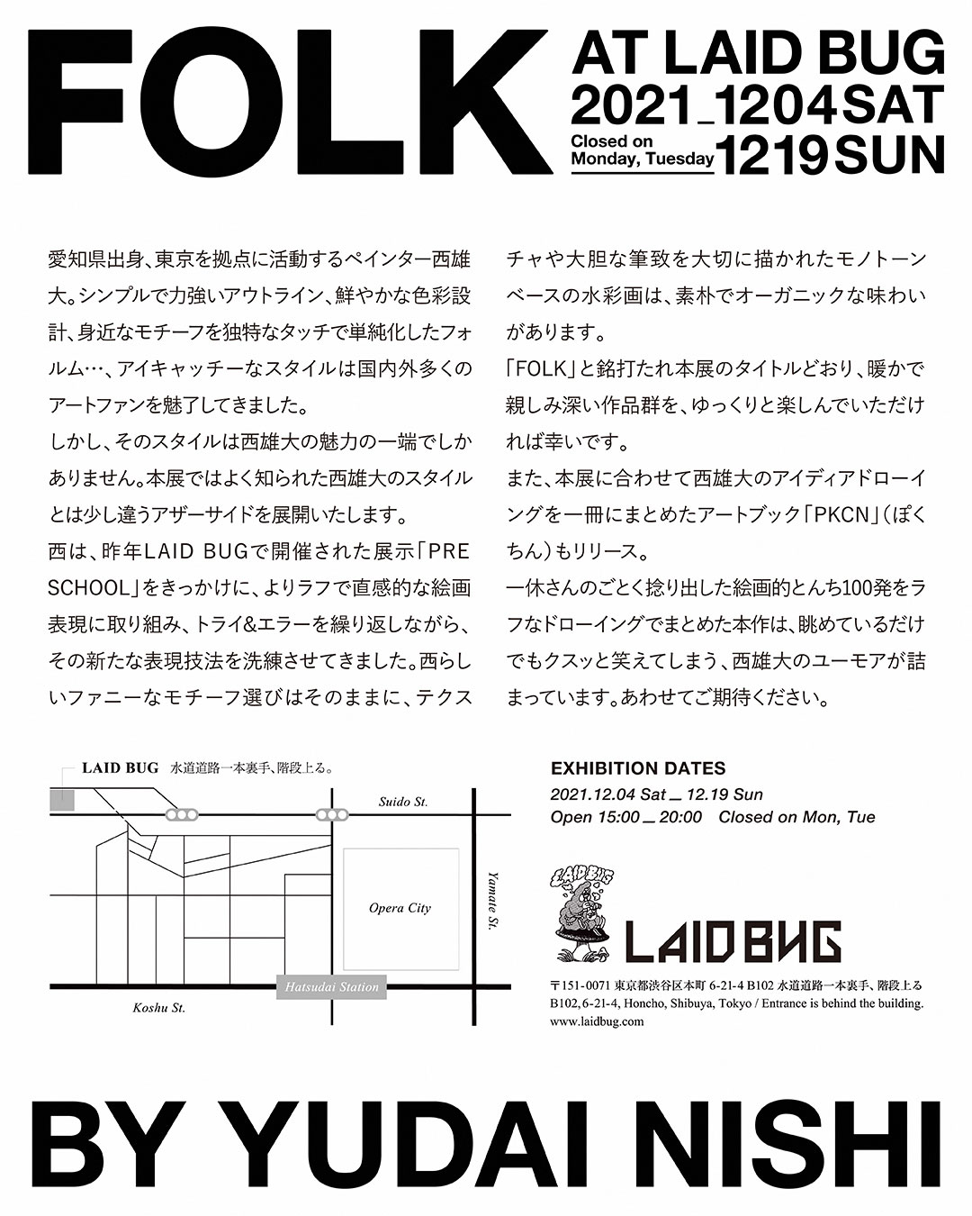 1991年愛知県に生まれ、2014年頃から多くのグループ展や個展を開催してきた西。「FOLK」には、強度の高いアウトラインと豊かな色彩で知られる西のパブリック・イメージとは異なる新作を出展。昨年9月にLAID BUGで開催された個展「PRE SCHOOL」以降に取り組んできた、モノトーン基調の水彩画が展示販売されます。また同展に合わせ、アイディア・ドローイングをコンパイルしたアート・ブック『PKCN(ぽくちん)』(LAID BUG)も刊行。“絵画的とんち100発”が掲載される同書は、デザインをLAID BUGの木内俊文、実光政直が担当しています。