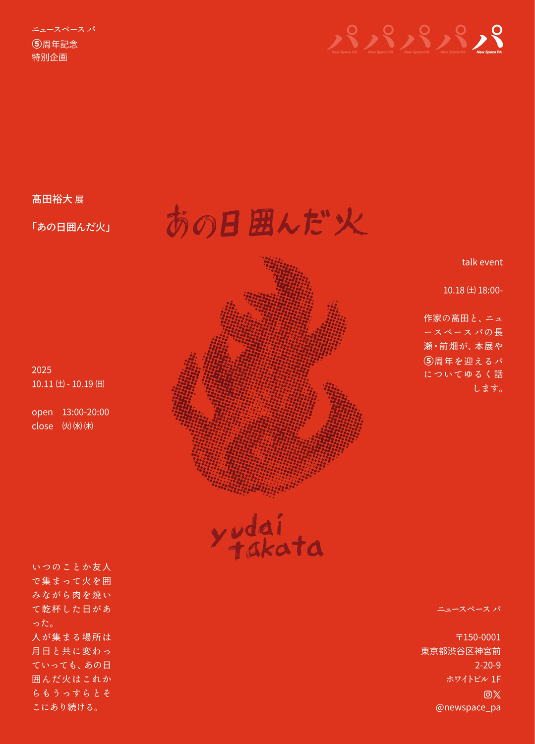10月16日(木)にオープンから5年目を迎える東京・神宮前 ニュースペース パが、これを記念した特別企画展として、岐阜・多治見在住の画家・髙田裕大(Yudai Takata)によるソロ・エキシビション「あの日囲んだ火」を10月11日(土)から19日(日)まで開催。