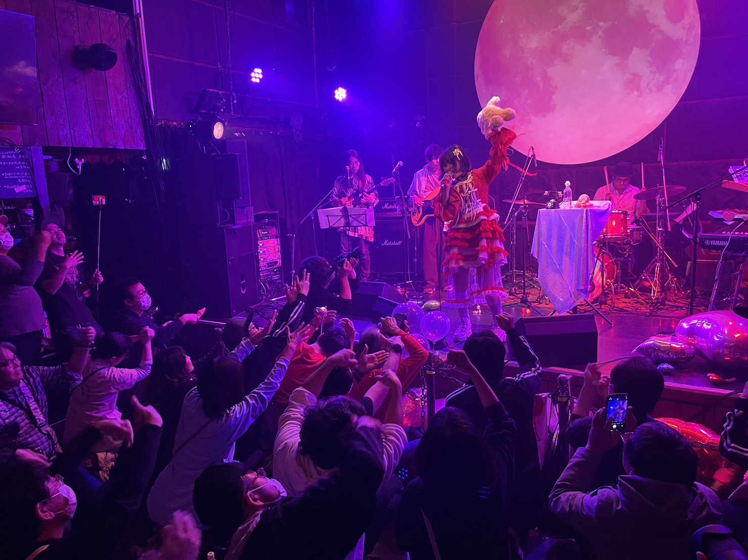 2曲目は4年前に開催された月見ル君思フでのワンマン・ライヴでも歌った曲「水色」。生きることに失望して月に行ったけど、逃げちゃダメだと思って地球に帰って来た、と4年前の思い出を交えつつ、MCでは歌詞のテーマでもある“何かをするのに年齢は関係ない”、“死ぬまで歌い続けたい”という思いを重ね、「PANTAさんは死ぬまでステージに立っていた。私もそんな風になりたい」という力強いメッセージに勇気づけられた。