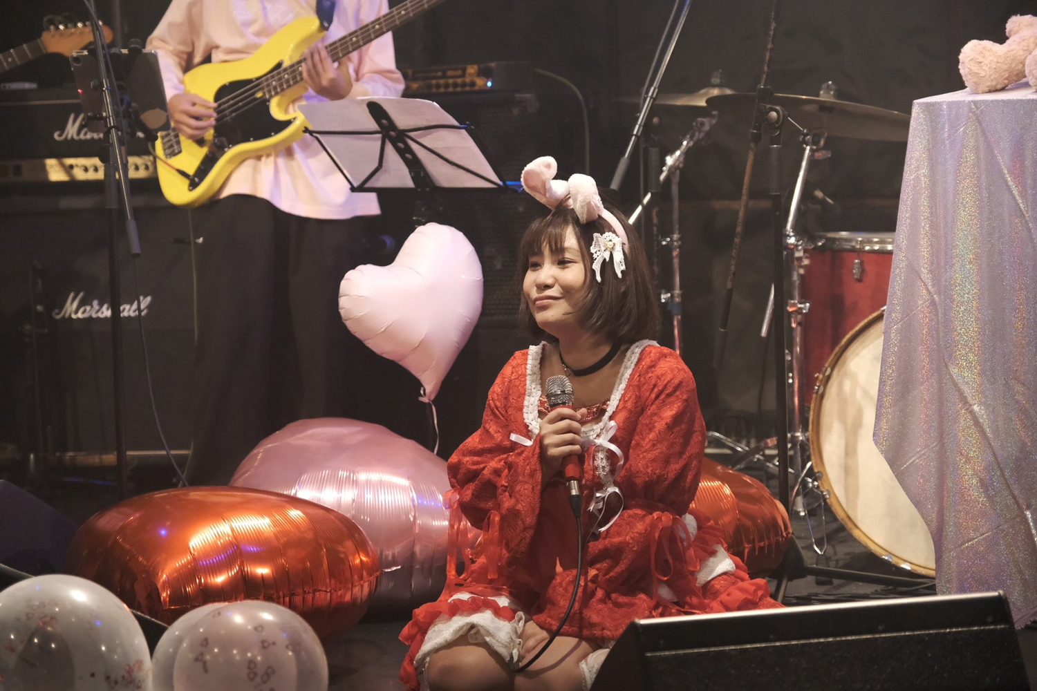 本編は事前に明かされていた通り、『恋愛ハラスメント』同様の曲順で組まれたセットリストで、アルバムの世界観を表現するものになった。「楽しい1日にしようね」との短いMCから始まった1曲目「お菓子な家」は、バンド・アレンジの完成度が高く、まさに冒頭に相応しい曲。ファンの協力のもとでステージに溢れた赤やピンクの風船を掻き分けて前方に出ると、ここまで付き合ってくれた観客に感謝を述べた。 2曲目「花火」はアルバム中で最もポップな曲。疾走するドラムに、ギター、キーボード、ベースがそれぞれの個性を出しながら爽やかに絡み、ライヴハウスが一気に夏に戻ったようだった。