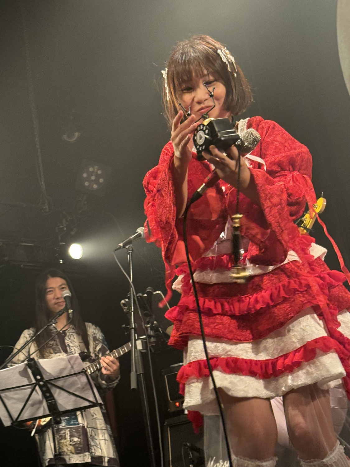 続く「サイダー」では、独特のメロディを静かながらも情熱的に歌い上げるヴォーカルと、煌びやかな鍵盤のアドリブをじっくり聴かせた。「ハリボテの恋」ではスリリングなギターをバックに、歌詞にも登場するテディベアを抱きしめながら「私の孤独に触れていてよ」と力強くも恋する女性の脆い心情を歌い上げた。そして5曲目は、短冊CD(8cm CD)でリリースされた「天の川ぶち壊す!」。キャッチーなディスコ・サウンドと小日向の「月見ル君思フをぶち壊す!」の掛け声に観客のボルテージが一気に上がった。小日向はこの曲の演奏中、後に使う予定の小道具でもある電話を壊してしまうというハプニングに見舞われた。それほどの盛り上がりぶりだった。MCの時間を使って修理を試み、この間ファンには6曲目にあたる「ブラックコーヒー」のコール・アンド・レスポンスの練習をさせるという小日向由衣らしい展開に。会場も和やかモードに変わり、笑い声で溢れた。コール・アンド・レスポンスを続けていくと次第にギターは激しさを増し、演奏が始まると熱の帯びたヴォーカルで客席を沸かせた。