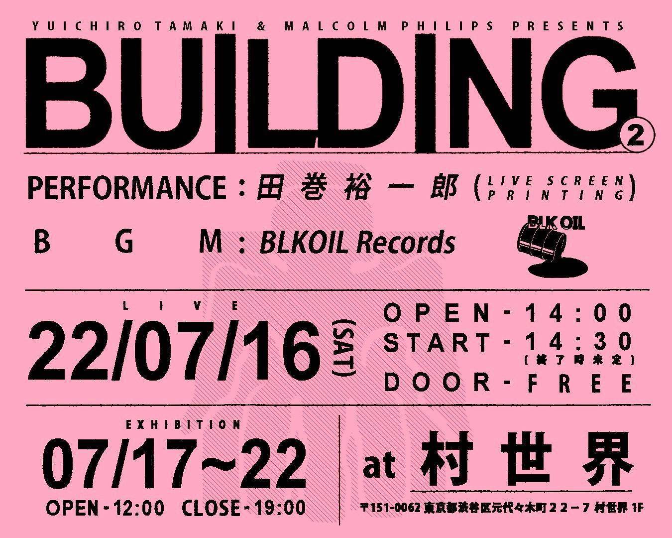 4月に那倉太一(ENDON | G.G.R.R. | SLAVEARTS®︎)、阪本剛二郎(CARAVANA ANARQUISTA, JDOW | 横浜邦楽邦舞家協会)と組んだJUSTICEでの1stフル・アルバム『JUSTICE』([...]dotsmark)を発表して話題となっている美術家・田巻裕一郎が、ライヴ・シルクスクリーン・プリンティング + エキシビション「Yuichiro Tamaki & Malcolm Philips Presents "BUILDING②"」を東京・代々木上原 村世界にて7月16日(土)から22日(金)にかけて開催。