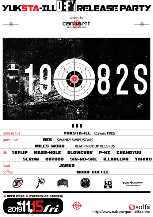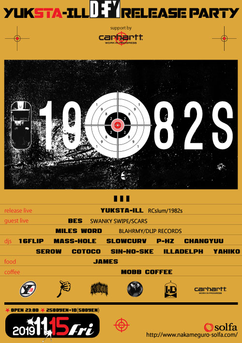 昨年から東京・中目黒 solfaで開催されているDJイベント「1982s」が、今年2月にYUKSTA-ILLがリリースしたの3rdアルバム『Defy』のリリース・パーティ東京編を「Carhartt WIP」のサポートで11月15日(金)に開催。