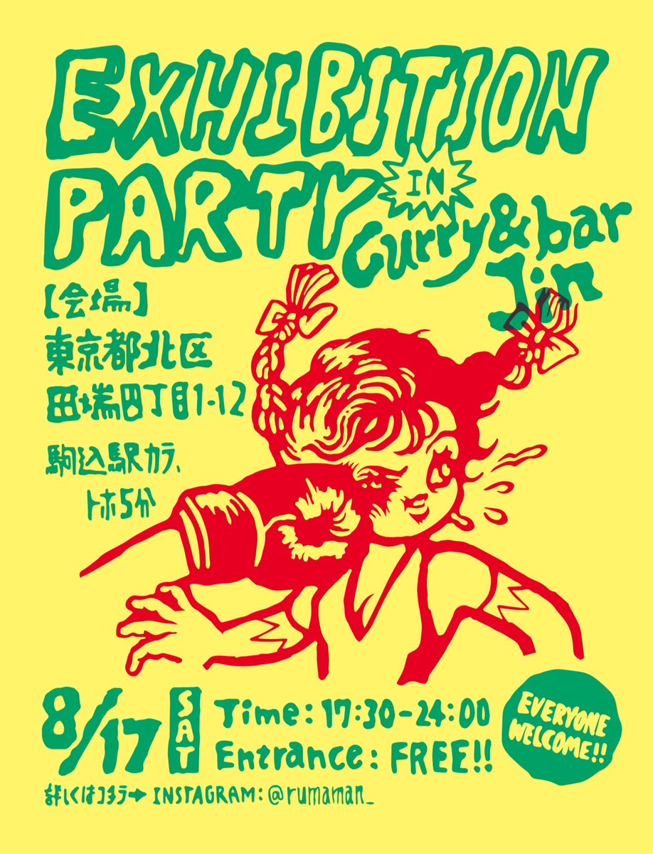 東京・駒込のカレー店 / バー「Curry & Bar Jin」での長期に亘るソロ・エキシビション「GARBAGISM MY TURN」を開催中のイラストレーター / ペインター・津波 夢が、同展と連動したパーティ「Summer Exhibition Party @Curry & Bar Jin」を同地にて開催。