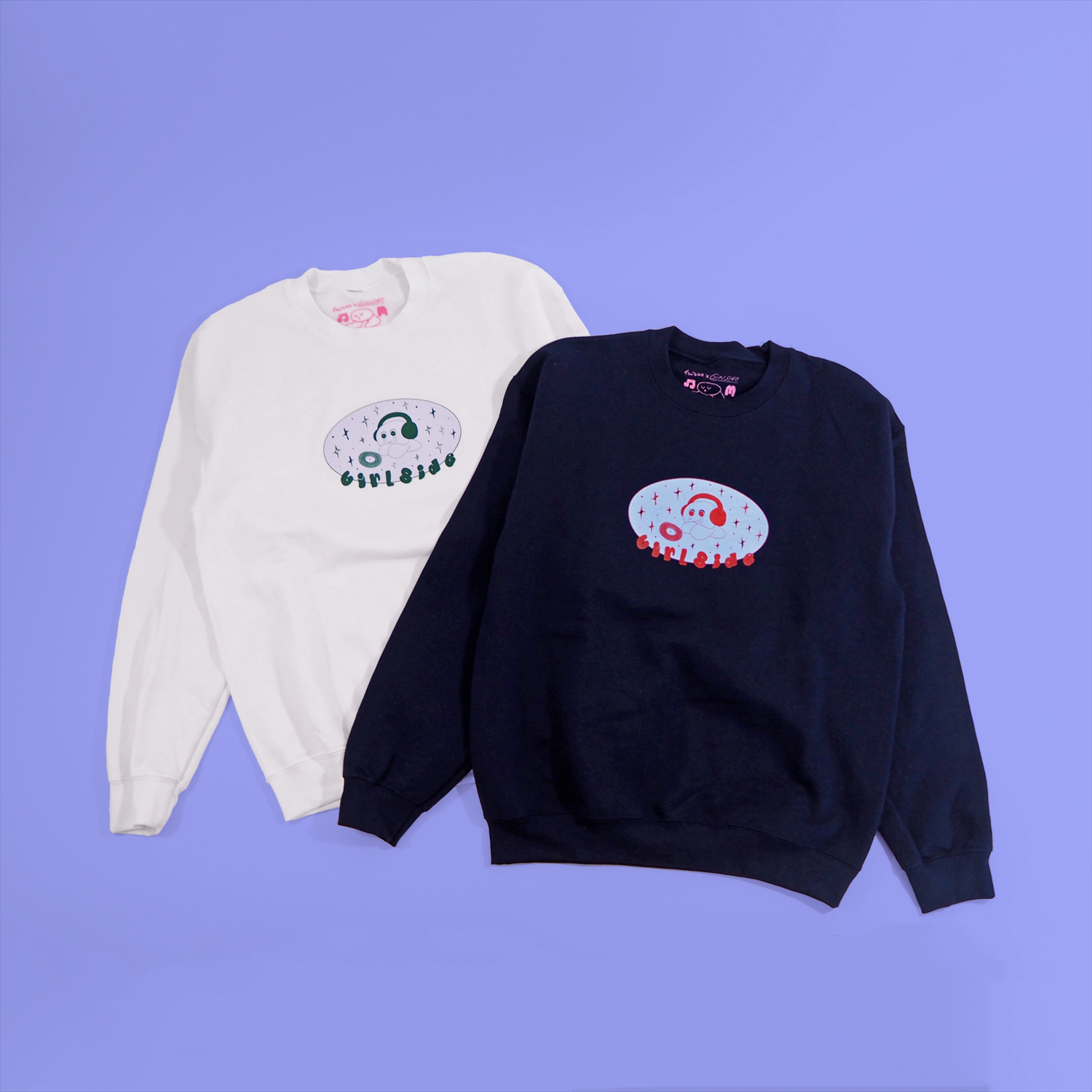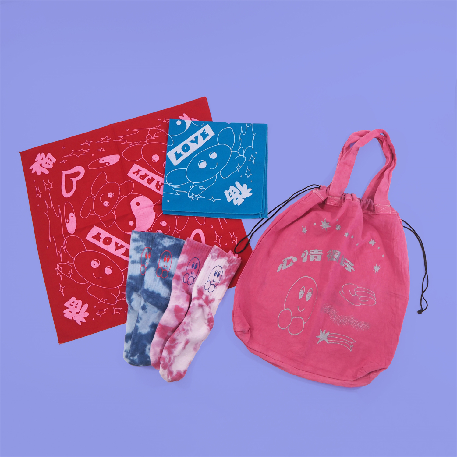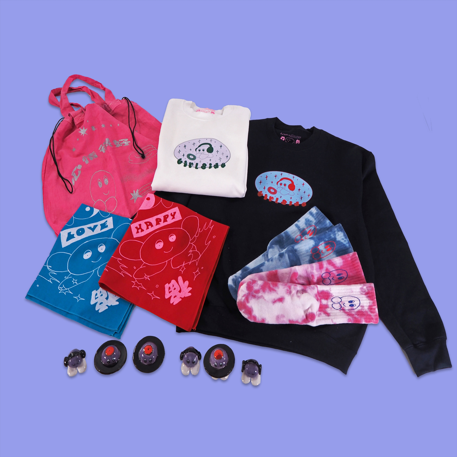 同展では、ソックス、バンダナ、12"ヴァイナルが収納できるサイズのトート・バッグといったオリジナル・アイテムに加え、オリジナル・キャラクター「そいつ」の陶器作品を限定販売。レコードに挟まった「そいつ」とヘッドフォンを着用した「そいつ」の2種。Girlsideとのコラボレーション・スウェットも特別販売されています。