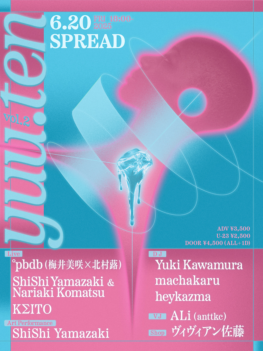 DJ / コンポーザーとしてのみならず様々な分野で活躍するheykazmaが、“音に溶ける”をコンセプトに掲げてオーガナイズするパーティ「yuu.ten」の第2回を6月20日(金)に東京・下北沢 SPREADにて開催。当日に先駆けてグラフィックデザイナー・木村銀次によるフライヤー・アートが公開されています。