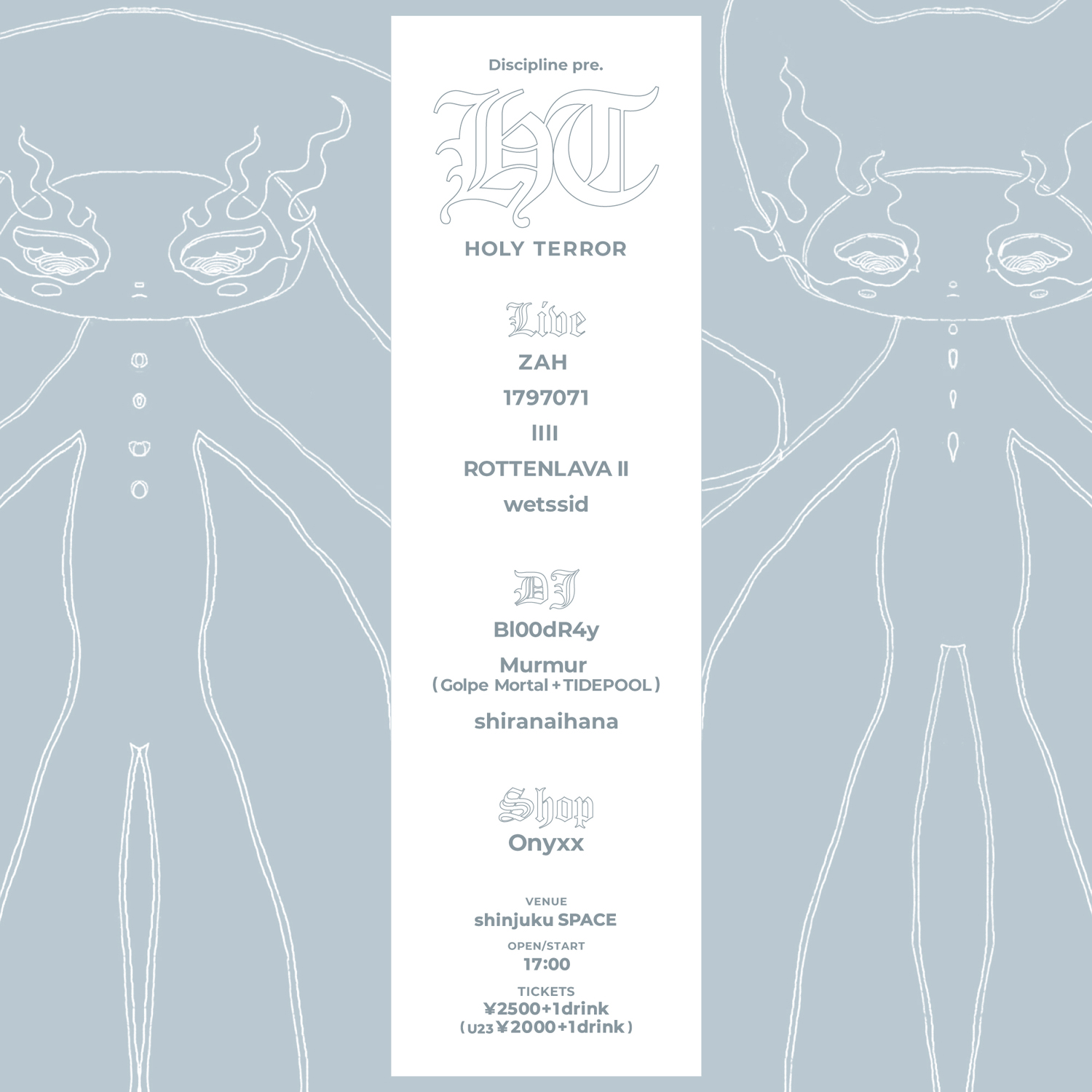 3月には東京・下北沢 SPREADで開催されたJACKSON kaki主催公演でのパフォーマンスが話題となったZAH。「HOLY TERROR」への出演は、「Discipline」メンバー・1797071との親交から実現したもの。当日は1797071、lIlI、ROTTENLAVA II、wetssid、ZAHのライヴ・パフォーマンス、Bl00dR4y、Murmur(Golpe Mortal + TIDEPOOL)、shiranaihanaによるDJに加え、Ms.Machine / SOM4LIメンバーが主宰するセレクトショップ「Onyxx」のポップアップも予定されています。