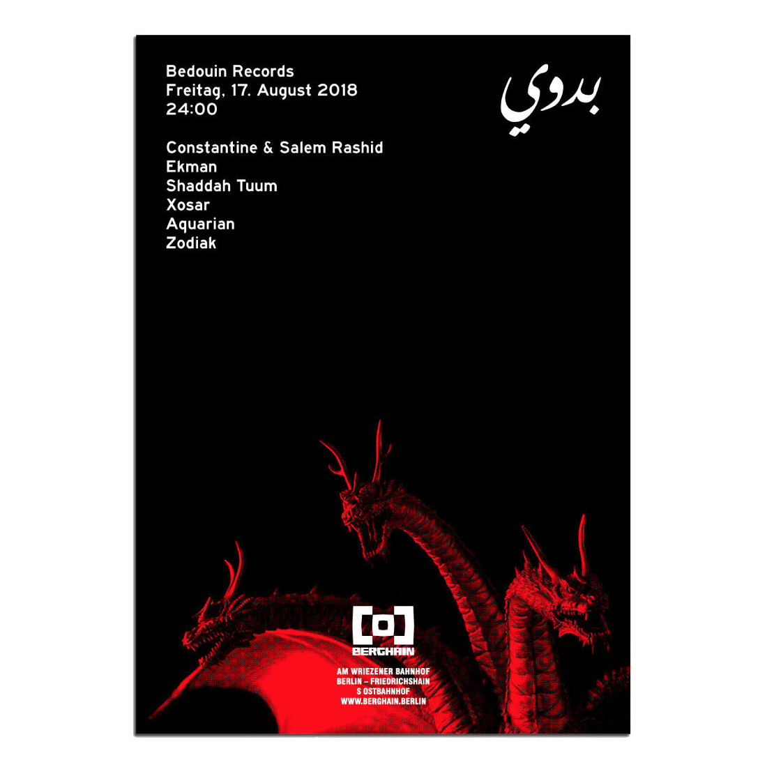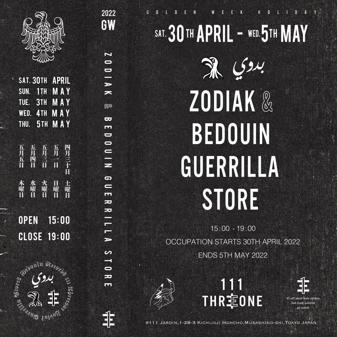 Jigga aka Hiiro Issiki、Mars89、Ryo Murakami、¥ØU$UK€ ¥UK1MAT$Uらの作品や、EARTAKER、Granule、she luv itのヴァイナル・リリースでもおなじみのSalem Rashid主宰レーベル「Bedouin Records」と、同レーベルのデザイン面を担い、自身もDJとして活躍するグラフィック・デザイナーTakashi Makabe aka Zodiakが、ポップアップ「ZODIAK & BEDOUIN GUERRILLA STORE」を4月30日(土)から5月5日(木)までKei Sasaki(S.K.SCUM)が主宰する東京・吉祥寺のデザイン・スタジオ / ショップ「111 THR丰ONE」にて開催。