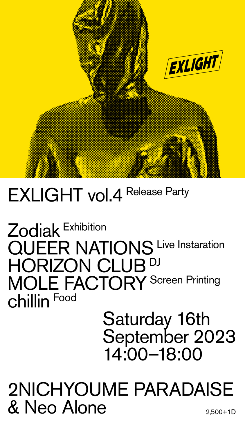 同書は、「2NICHYOUNE PARADAISE / NEO ALONE」が2021年にスタートし、これまでに37A(P/HOUSE)、Buffalomckee、ohiana(A.C.C)がラインナップしているジン「EXLIGHT」シリーズの第4弾として制作されたもの。Zodiakによるグラフィックのアーカイヴをリソグラフ・プリントで26頁に亘って収録するほか、同じくデザイナーとしても知られるMATERIALによる音楽プロジェクト・QUEER NATIONSの音源を収めフレキシ・ディスクを同梱。Zodiakとの縁深い街であるベルリンのシティスケイプを捉えたDVDも付属します。なお、QUEER NATIONSは本作が初のフィジカル・リリース。